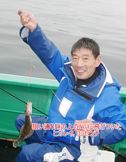 | 4月29日 越喜来湾鬼沢漁港 栄丸さんで 永島社長に待望の44cmのマコガレイ | |