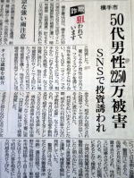 今日の秋田さきがけ新聞に「横手市50代男性2250万円被害 SNSで投資誘われ」の記事が載っていた。フェイスブックを通じて女性を名乗る相手と知り合いラインでやりとりするようになった・・・と