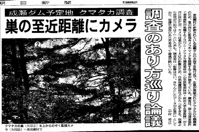 クマタカ調査の例としては、緑資源公団が行っている山形県朝日町の林道工事がある。予定地から500メートルのところにクマタカの巣があり、95年から今年まで数カ所の定点で望遠鏡による観測を続けている。同公団は「観察による圧迫感を与えないためカメラは使わなかった。定点観測もカムフラージュ用のテントを使っている」という。