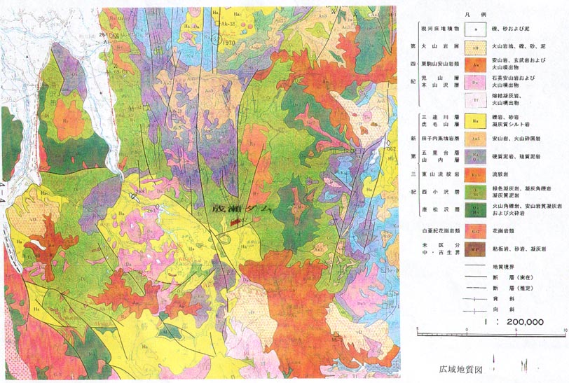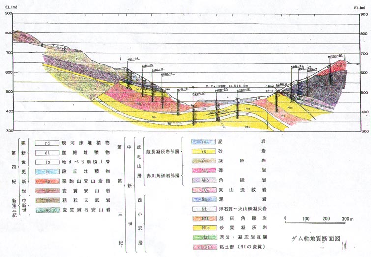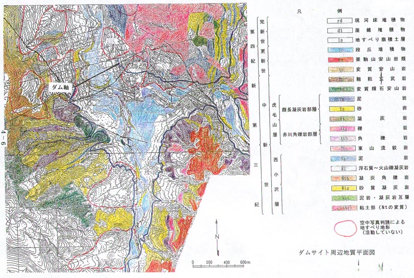 ■レポートの図4−4に広域地質図がでています.ダムサイトまで北から2本大きな実在断層が来ており,そのすぐ上流には東西方向の断層も見れます.ダム湖になる部分には,この上に「三途川層・虎毛山層」とよばれる礫岩,砂岩,凝灰質シルト岩の層が覆い被さっているように見えます.この層の下がどんなふうになっているのか,といった調査が必要なのではないでしょうか?