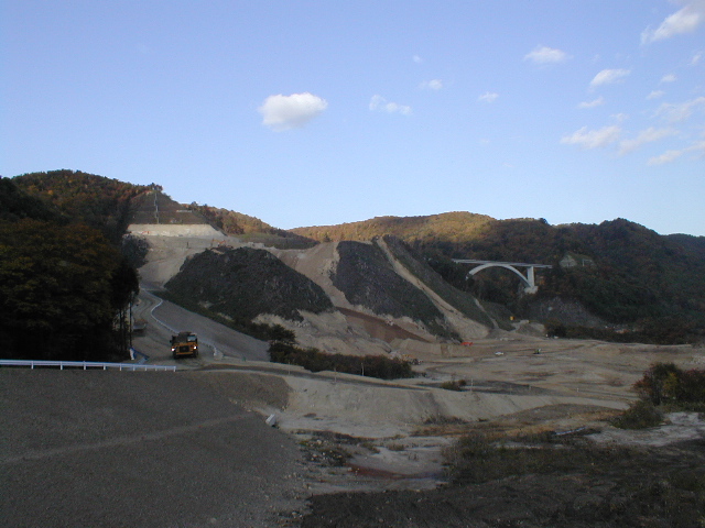 一部開通した国道397号の付け替え道路は,栗駒国定公園焼石地区の森を切り崩して工事が行われている。廃村となった旧石渕地区から付け替え道路に上がっていく途中で,ダム本体の基礎工事現場を望む。森吉山ダム現場でみたのとおなじ巨大な46トン車が,ヘッドライトを点灯して土砂を運んでいく様子が見えた。あの土砂はダム左岸斜面から吐き出された土塊だろう。