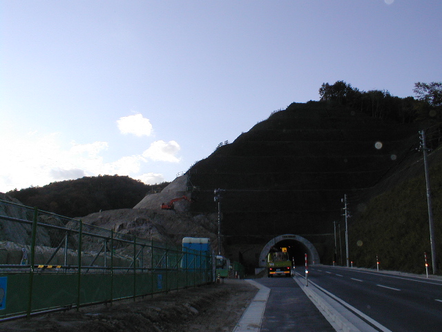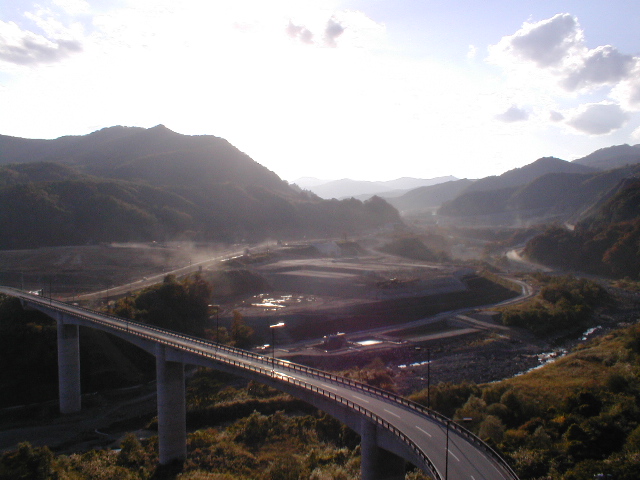 道路は途中から旧道へ下りる。バイパスと旧道との連絡道路にすぎない「望み大橋」は,胆沢川に架けられたこれまた立派な橋だ。なにせ胆沢ダム事業費は2440億円。当初見込みでは1360億円と,成瀬ダム(現時点で1550億円)より少なかったのだ。森吉山ダム事業費が1000億円弱から1750億円に膨張したことは先のルポで書いた。橋の向こうには近い将来に巨大な岩石の集合体がデデーンとそびえるのだろう,46トン車がここでも砂塵を巻き上げながらのそのそと移動していく。夕暮れどきのダム工事現場は,土ぼこりで石渕ダムがかすんで見えた。