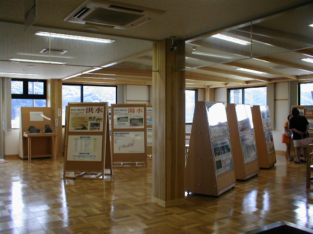 『広報館』に入ってみる。お盆休みの日曜だけに見学者が多い。建物は木材をふんだんに使用してエコロジーの演出ぶり。広々としたフロアには森吉山ダムのPRパネルをところ狭しと掲示してある。木製の机と椅子を並べた教室ふうの研修室も。美人顔の案内嬢にかんたんに話を聞いてみた。