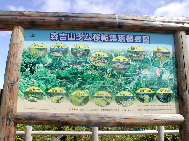 建物を出てふたたび展望広場へ。広大な建設現場を背景に,ダムの概略図のパネルがここにも掲げられている。ひときわ大きな建て看板は『森吉山ダム移転集落概要図』。ダム工事によってふるさとを追われた民家・学校などの,過去をしのぶ絵柄が午後の陽ざしを浴びていた。