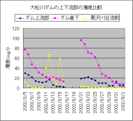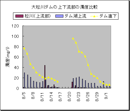 大松川ダム上下流部の濁度比較(平成14年8月濁度データ)
