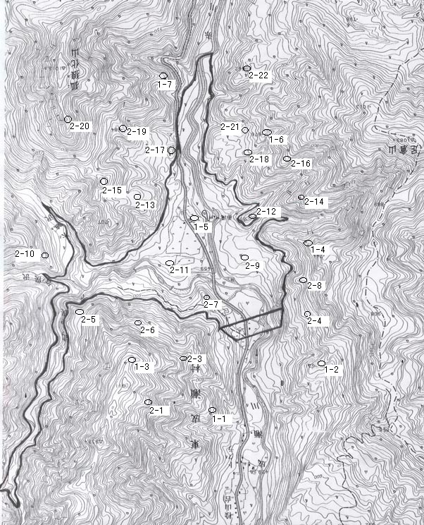 (太線はダム湛水域、数字は基準点ポイントを示す−例えば1-3は1級基準点No.3−)