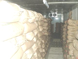 低温倉庫の内部です。 ファン付冷機で常に冷風を送っています。 薄着で中に入ると寒いぐらい。 |