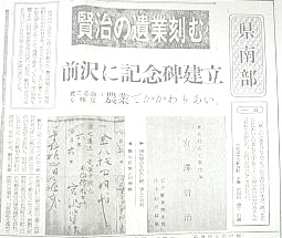 平成8年、宮沢賢治生誕100年を記念して、記念碑を建てる事が決まった時の新聞記事です。 記念碑は僕のおじいさんと賢治が土壌視察に訪れた当時の土地、(現在は小学校)に建っています。 |