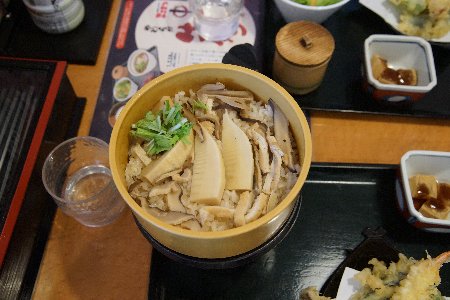 | 今朝は薄曇り。 季節はソメイヨシノから八重桜そしてボケへ。 昨日、1週間分の買い物。重くなるというのでお付き合い。 昼食は外食に。季節の筍ご飯を選択。美味。 |