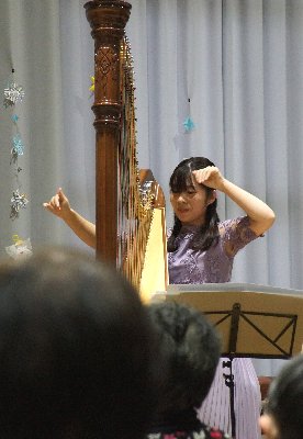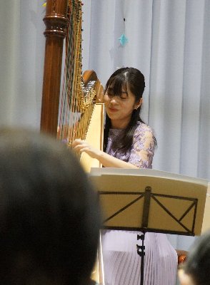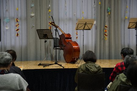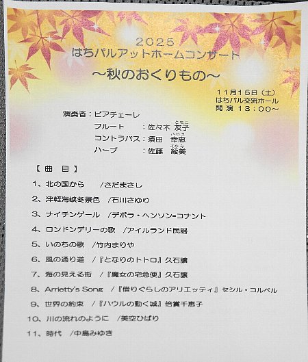 | 今朝は晴れ。気温が下がり霜が降りていました。 昨日今日と暖かい日が続いているせいか赤とんぼを遭遇。 写真は昨日の「秋の贈り物」コンサート。今回は2度目だそうです。 |