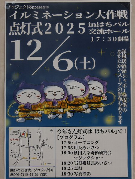 | 今週のお知らせ -------------------------------------- 12/06 秋田県歯科保健医療フォーラム 13:00 12/06 イルミネーション点灯式 12/07 はちパル10周年行事 JR吹奏楽団演奏会 -------------------------------------- |