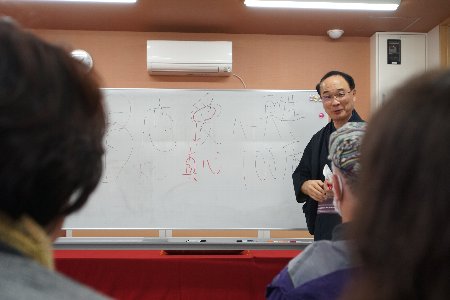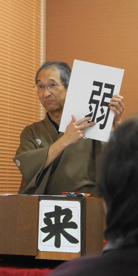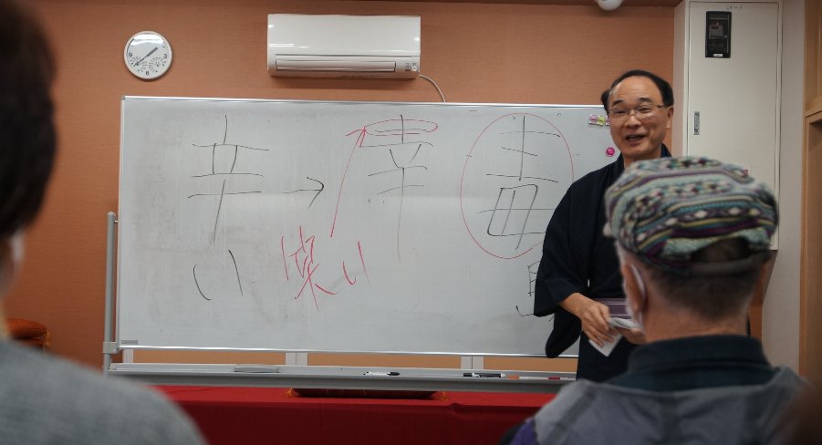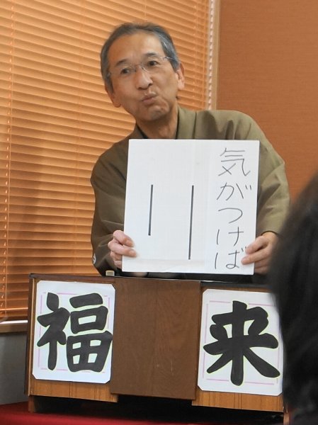 ![]() 最後は「辛い」の字に一字加えると「幸福」の字、この一字は「笑い」と紹介 |