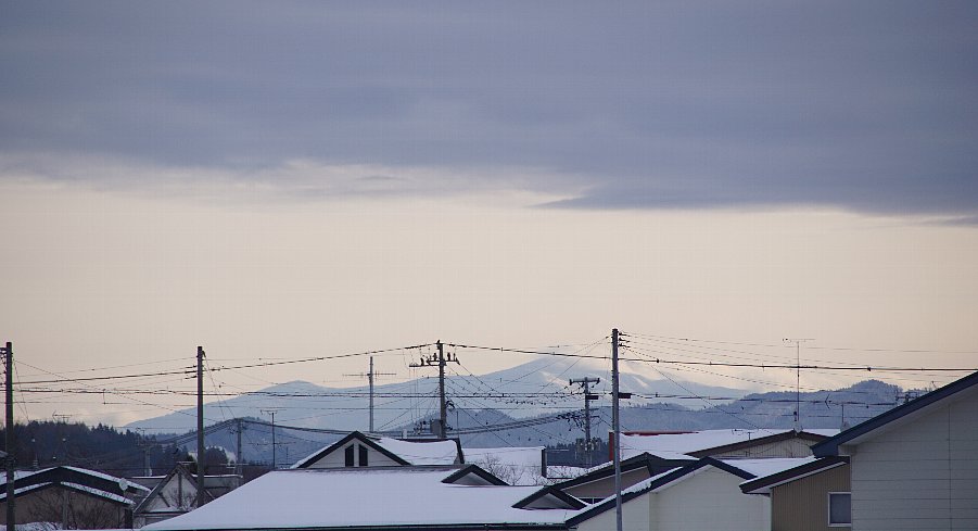 | 今朝は穏やかな朝。 吹雪の続く毎日ですが、時折青空が見えるようになりました。 遠く雪のかぶった山が森山の右側に見えてきました。森吉山のようです。 |