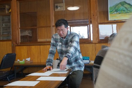 | 今朝は晴れました。 写真は昨日開催された町内会総会。旧小学校の再利用計画は足踏みのようです。 |