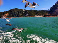 午前10時30分・遊覧船に乗る。遊覧船に乗るのは今回で3回目。波は少しあるが晴天。実は昨日乗船する予定だったが波が高かったの運休だった。正に「待てば海路の日和あり」を実感した。カモメに餌を投げるとカモメが餌を奪い合う姿が面白い・・・子供に帰ったような気分・・・