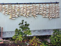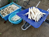 昨日収穫した大根を天日で干す為パイプに吊るす。