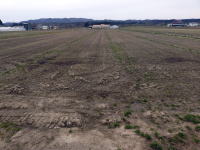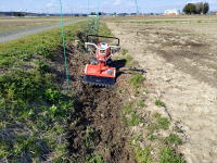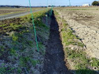 午後・西瓜畑の排水路の土あげ。最初、ミニ耕運機で排水路の土を砕き、その後スコップで土を上げる。外で働くと気分が良い。