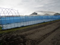 午前・育苗ハウスと育苗器を利用しない(無加温)露地プール育苗に防風ネットを張る。